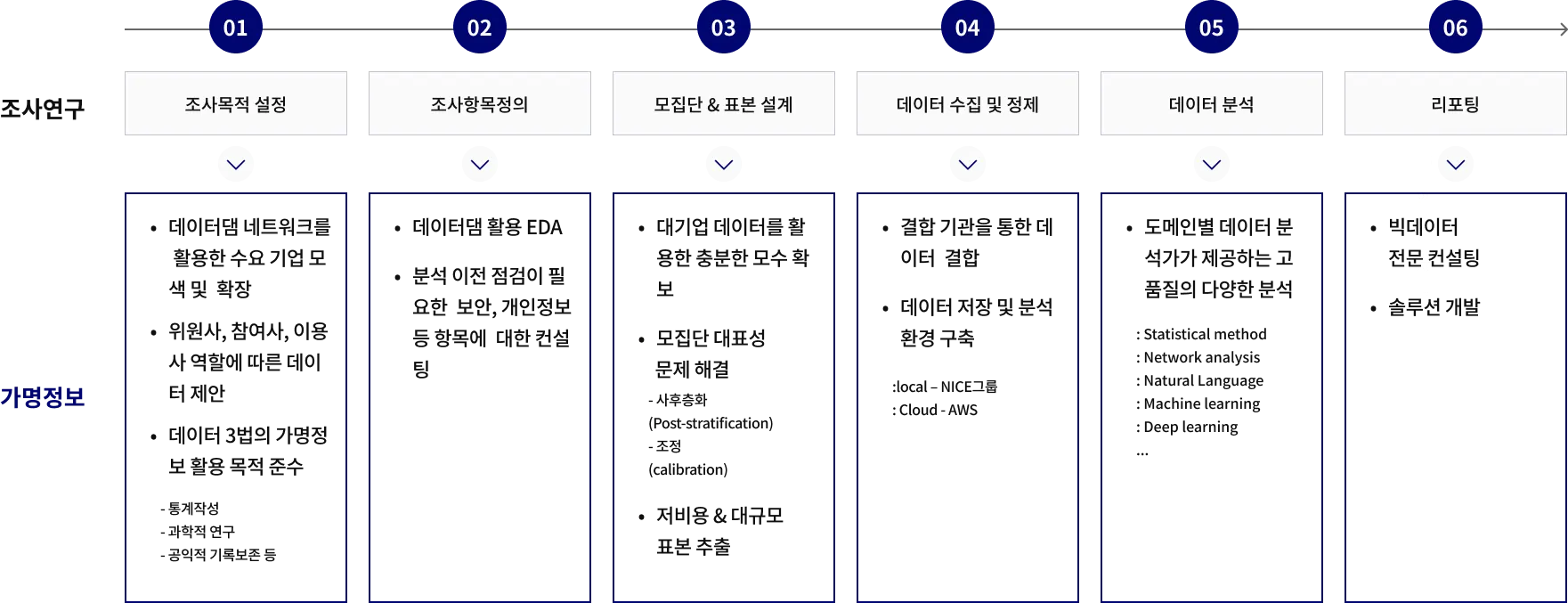 조사연구의 기본적인 프로세스 단계별로 가명정보를 활용하면 객관성이 추가로 부여되기 때문에 고품질의 조사 연구가 가능합니다.