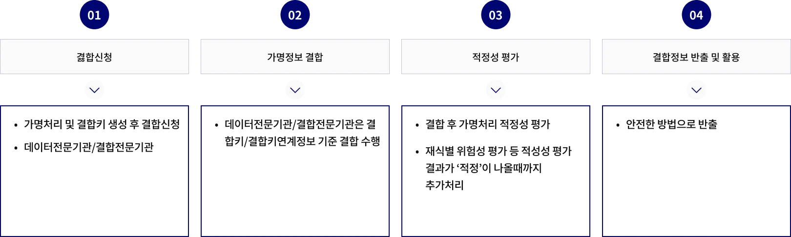 전문기관 결합신청부터 결합키 생성, 사전결합률 확인, 추가 가명/익명처리, 반출 전 프로세스에 대해 지원합니다.
