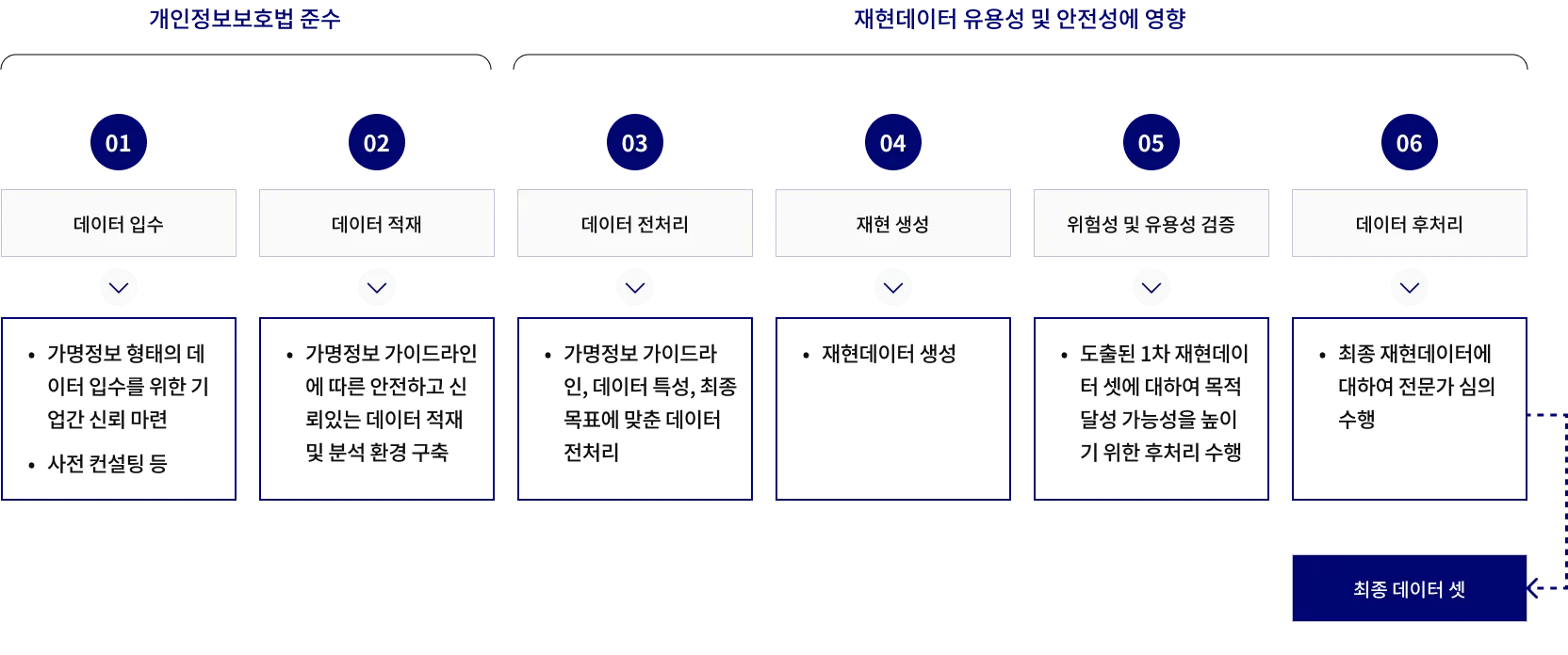 합성처리 후 익명성 검증 등의 프로세스를 거쳐 상품성 및 사업화 가능성을 검토함으로써 새로운 데이터 컨텐츠 개발 및 활용 사례 확보합니다.